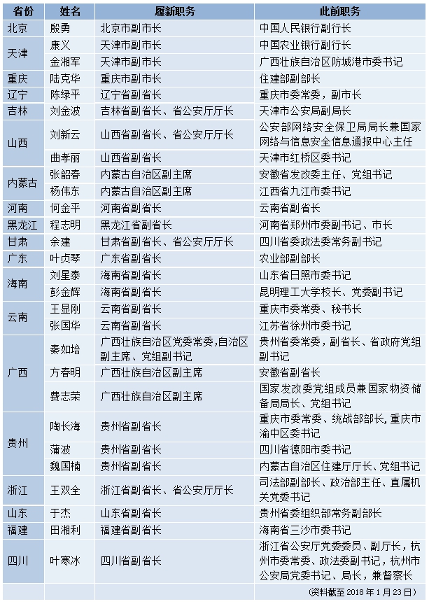 新華網(wǎng)北京1月24日電(記者陳淑君 李志強(qiáng))2018年省級(jí)地方兩會(huì)大幕開(kāi)啟,多地黨政領(lǐng)導(dǎo)班子近日迎來(lái)密集調(diào)整。1月19日到23日,重慶、廣西、甘肅等地省級(jí)黨委常委班子成員陸續(xù)調(diào)整,北京、天津、內(nèi)蒙古、遼寧等十九省區(qū)市28位省級(jí)政府副職履新。