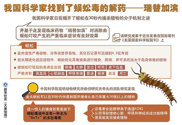 圖表:我國(guó)科學(xué)家找到了蜈蚣毒的解藥——瑞替加濱 新華社發(fā) 大巢制圖