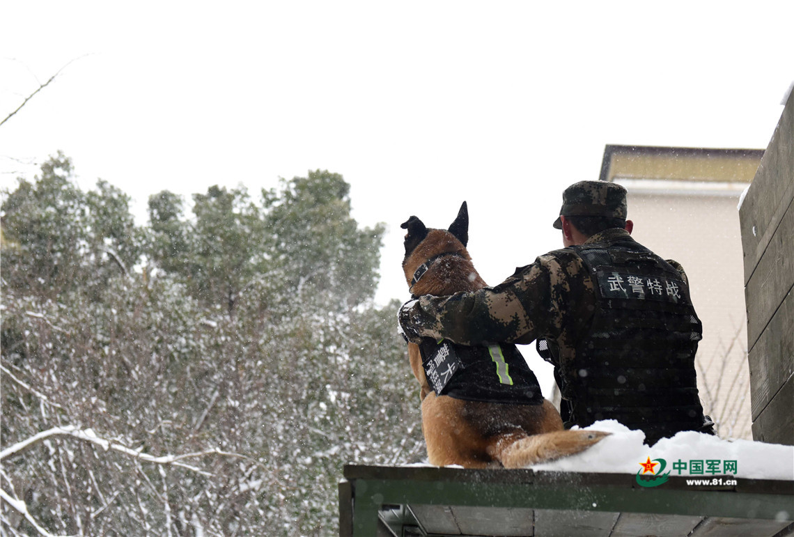 1月27日,武警安徽總隊(duì)機(jī)動(dòng)支隊(duì)警犬班班長(zhǎng)王營(yíng)廣與警犬“魯克”互動(dòng)交流,增進(jìn)情感。