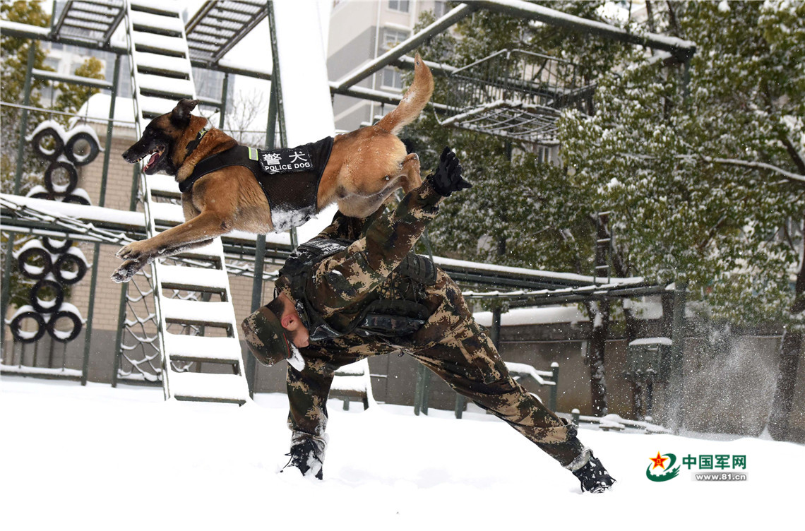 1月27日,武警安徽總隊(duì)機(jī)動支隊(duì)警犬班班長王營廣與警犬“魯克”進(jìn)行人犬結(jié)合訓(xùn)練。