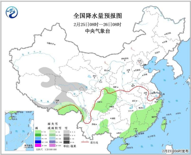 25日08時(shí)至26日08時(shí),青藏高原中部和南部等地有小雪或雨夾雪;西北地區(qū)東南部、四川盆地、江南南部、華南中東部、云南西北部和東南部、海南島、臺(tái)灣等地有小雨。內(nèi)蒙古中西部等地有4~5級(jí)風(fēng)。