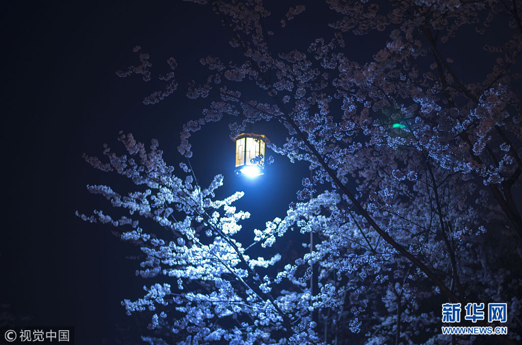 3月25日,揚(yáng)州鑒真大道,夜幕下的櫻花,在燈光月色的輝映下別有一番意境。(圖片來源:視覺中國(guó))