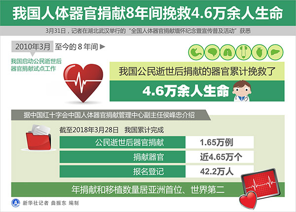 新華社武漢4月1日電(記者馮國(guó)棟)記者31日在湖北武漢舉行的“全國(guó)人體器官捐獻(xiàn)緬懷紀(jì)念暨宣傳普及活動(dòng)”獲悉,2010年3月我國(guó)啟動(dòng)公民逝世后器官捐獻(xiàn)試點(diǎn)工作至今的8年間,我國(guó)公民逝世后捐獻(xiàn)的器官累計(jì)挽救了4.6萬(wàn)余人生命。