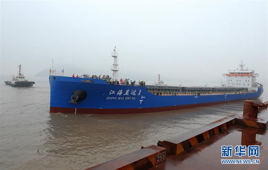 4月5日下午,“江海直達1”號在拖船的協(xié)助下駛離浙江省舟山市鼠浪湖礦石中轉(zhuǎn)碼頭,首航安徽馬鞍山。新華社發(fā)(吳琳紅 攝)