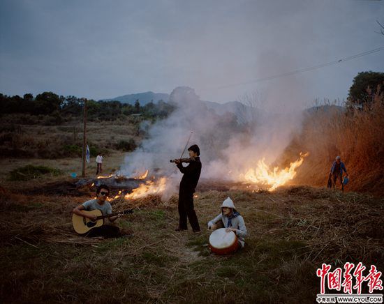 3月14日傍晚,福建省福州市閩侯縣關(guān)中村,“南部生活”共識(shí)社區(qū)成員在墾荒前將蘆葦和野草燒掉,日本建筑師吉富遙樹、社區(qū)發(fā)起人唐冠華和邢振(左至右)見到燒荒的場(chǎng)景,臨時(shí)起意來(lái)到現(xiàn)場(chǎng)演奏。