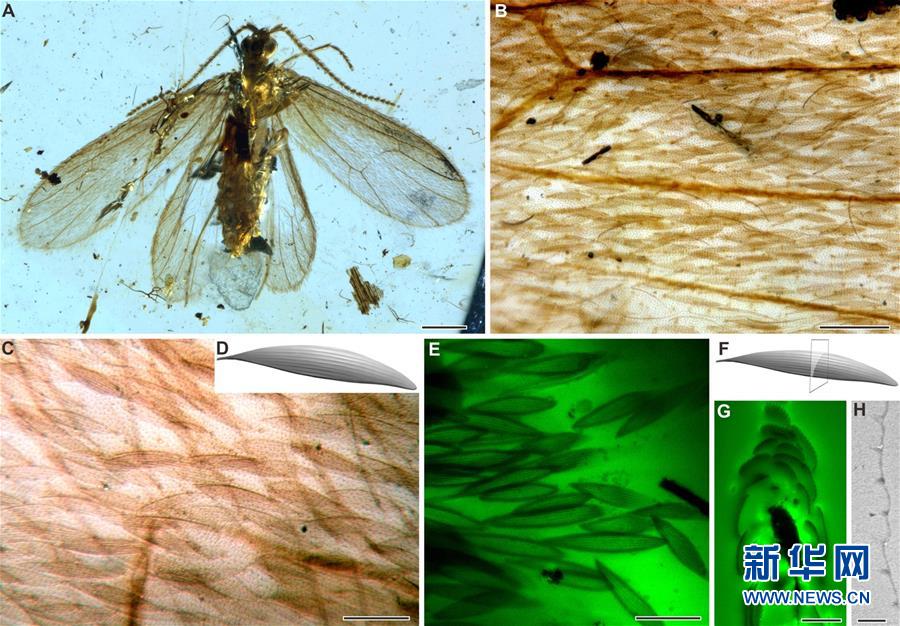 緬甸琥珀中飄翅目昆蟲及其鱗片結(jié)構(gòu)的圖片。新華社發(fā)(中國(guó)科學(xué)院南京地質(zhì)古生物研究所提供)