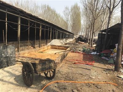 大院除了破敗的大棚,沒(méi)有任何養(yǎng)殖設(shè)施。新京報(bào)記者現(xiàn)場(chǎng)看到,一名養(yǎng)殖戶把清理出的糞便和污水裝進(jìn)小推車,然后倒進(jìn)院后的一條水溝里。