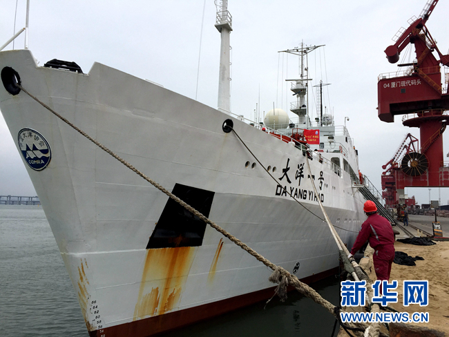 ??? 這是4月15日拍攝的??吭趶B門現(xiàn)代碼頭的“大洋一號(hào)”科考船。當(dāng)日,搭載“潛龍三號(hào)”無(wú)人無(wú)纜潛水器和70名科考隊(duì)員的“大洋一號(hào)”科考船從廈門起航,奔赴南海執(zhí)行“大洋一號(hào)”綜合海試B航段科考任務(wù)。這也是目前我國(guó)最先進(jìn)的自主無(wú)人潛水器“潛龍三號(hào)”首次出海。新華社記者 劉詩(shī)平 攝