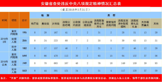 今年1至3月,安徽省共查處違反中央八項規(guī)定精神問題544個,處理749人,給予黨紀政務處分553人。