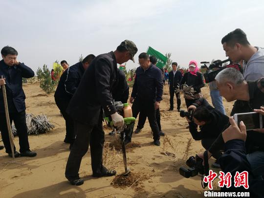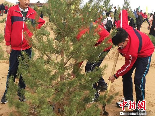 圖為在庫(kù)布其沙漠上舉行的“大型義務(wù)植樹(shù)活動(dòng)”現(xiàn)場(chǎng)。李?lèi)?ài)平 攝
