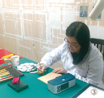 無影燈下,大大小小的毛筆、毛刷整齊排列,調(diào)色盤中墨色深淺不一,一臺小型分色測試儀隨時(shí)“待命”;桌上有根據(jù)文物原件打印出來的精細(xì)放大圖像和色彩分析數(shù)據(jù);右手邊是帶有通風(fēng)裝置的操作臺;房間盡頭處有帶過濾架的水槽,專供清洗印染后的紙張……