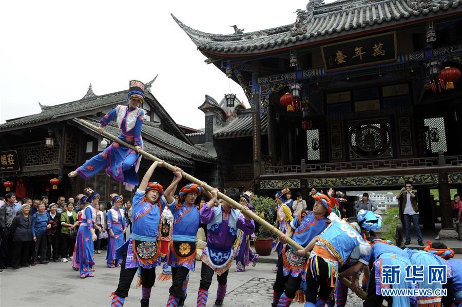 演員在汶川縣水磨鎮(zhèn)萬年臺進(jìn)行民俗表演(2012年5月23日攝)。新華社發(fā)(王飛 攝)