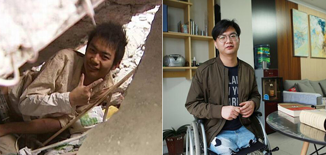 汶川地震中,18歲的薛梟被困廢墟80個(gè)小時(shí)。