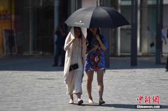 資料圖:北京街頭新人用衣服和傘遮陽(yáng)。中新網(wǎng)記者 金碩 攝