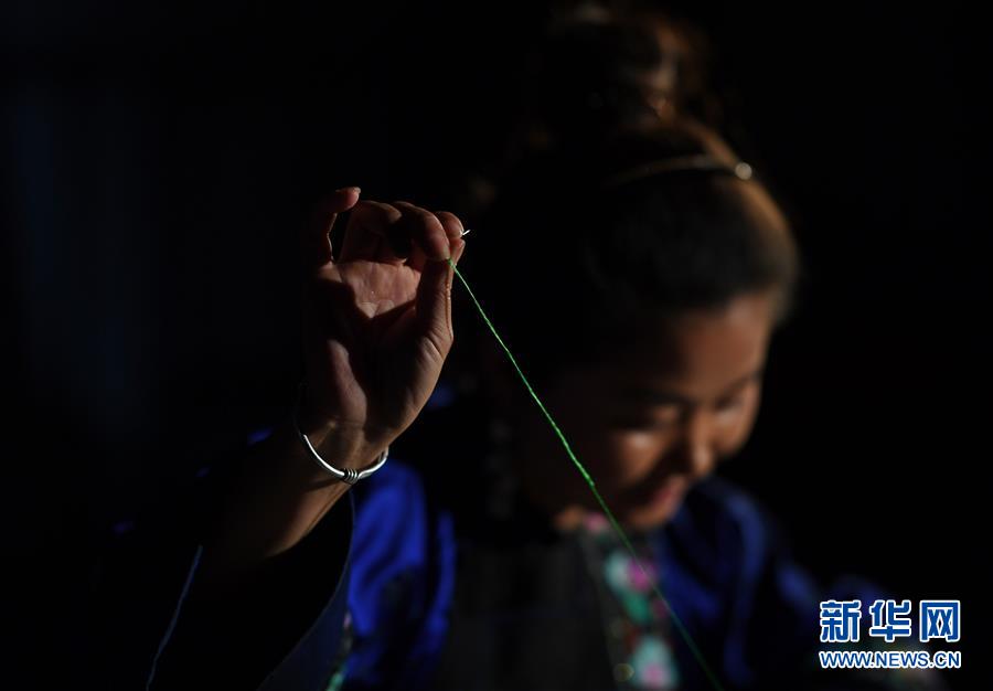 吳整萍在花垣縣石欄鎮(zhèn)苗繡創(chuàng)業(yè)培訓(xùn)基地里制作苗繡產(chǎn)品(4月16日攝)。新華社記者李尕?cái)z