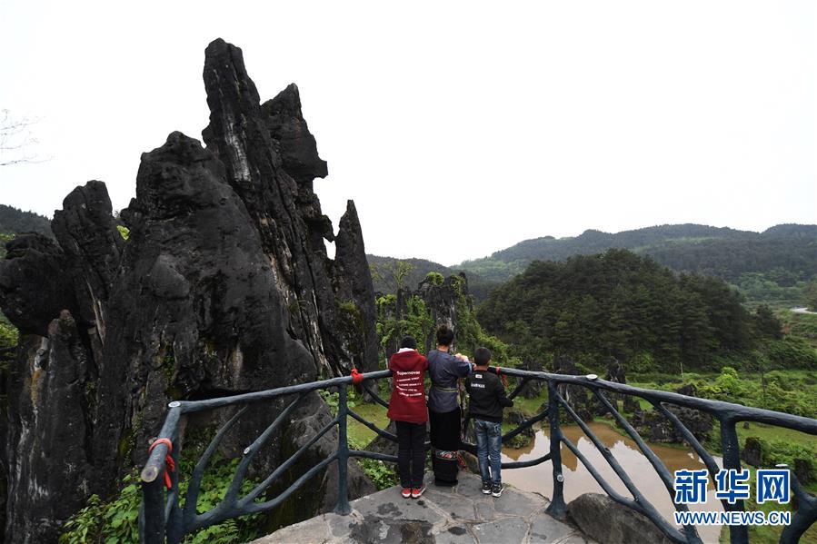 吳整萍帶著兩個兒子石文澤(左)和石文豪(右)在當(dāng)?shù)匾惶幘包c(diǎn)游覽(4月15日攝)。新華社記者李尕?cái)z