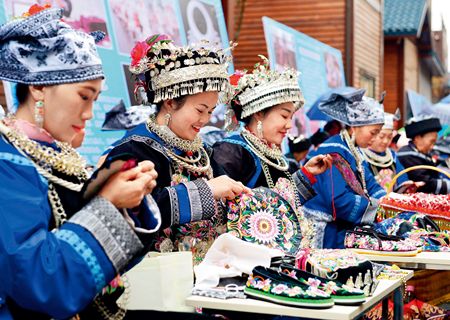 ▲貴州省黔東南苗族侗族自治州劍河縣,苗族婦女在展示刺繡技藝 楊文斌攝/本刊