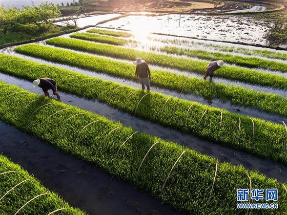 5月21日,在貴州省大方縣對江鎮(zhèn)金星村,村民在秧田里進行苗床管理。新華社發(fā)(羅大富 攝)
