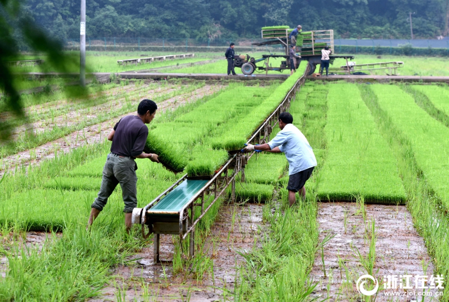 武義縣一育秧工廠員工忙著為訂單農(nóng)戶起運單季稻秧苗。