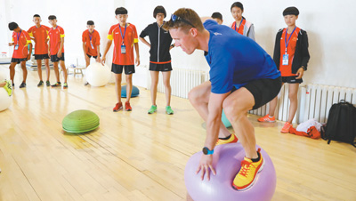 2018年全國第一期青少年越野滑雪夏令營日前在黑龍江省哈爾濱市開營,圖為教練正在進行訓練示范。郭傳委攝