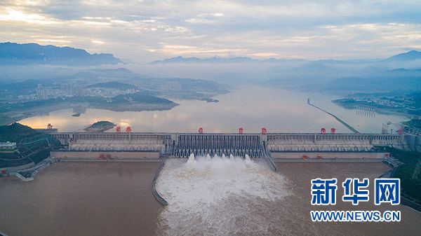 7月13日,三峽大壩開(kāi)啟泄洪深孔下泄上游來(lái)水,騰出庫(kù)容。新華社發(fā)(鄭家裕 攝)