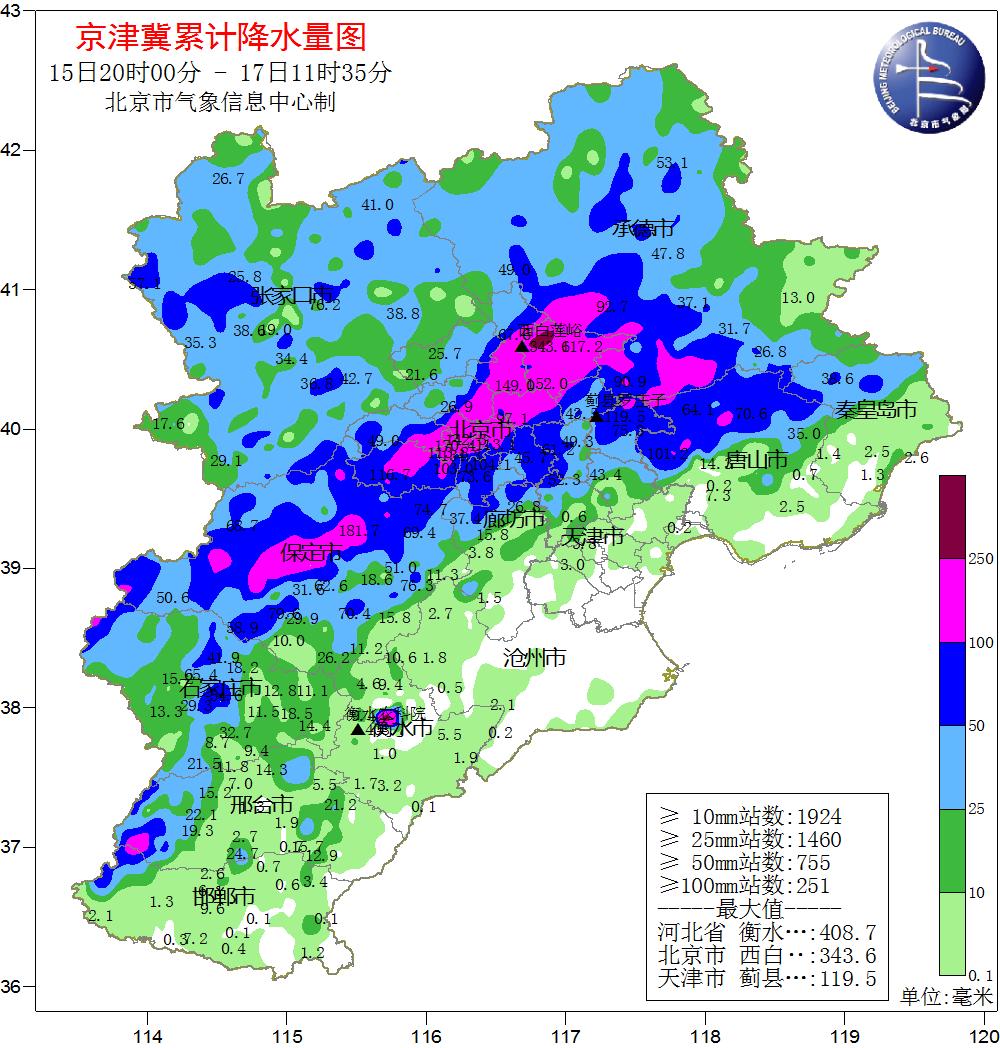 根據(jù)氣象觀測(cè),15日20時(shí)至17日8時(shí),北京市平均降水量達(dá)77.7毫米,城區(qū)平均100.9毫米,全市453個(gè)氣象觀測(cè)站中有121個(gè)超過(guò)100毫米、12個(gè)超過(guò)200毫米。其中,密云有2個(gè)測(cè)站超過(guò)300毫米,分別是西白蓮峪達(dá)(336毫米)和捧河巖村(302毫米)。