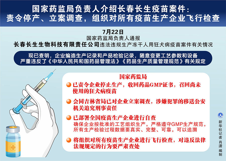 新華社北京7月22日電(記者齊中熙、趙文君)國家藥監(jiān)局負(fù)責(zé)人22日通報長春長生生物科技有限責(zé)任公司違法違規(guī)生產(chǎn)凍干人用狂犬病疫苗案件有關(guān)情況。這位負(fù)責(zé)人說,國家藥監(jiān)局已責(zé)令企業(yè)停止生產(chǎn),收回藥品GMP證書,同時會同吉林省局已對企業(yè)立案調(diào)查,涉嫌犯罪的移送公安機(jī)關(guān)追究刑事責(zé)任。國家藥監(jiān)局將組織對所有疫苗生產(chǎn)企業(yè)進(jìn)行飛行檢查,對違反法律法規(guī)規(guī)定的行為要嚴(yán)肅查處。