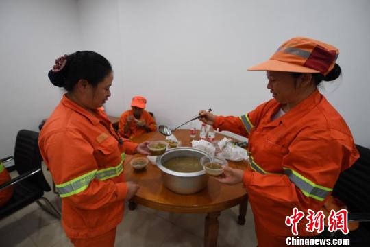 愛(ài)心驛站內(nèi),環(huán)衛(wèi)工人李紅霞為工友盛綠豆湯。王剛 攝