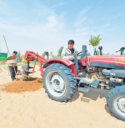 在庫(kù)布其用虹吸種植法植樹(shù)。記者 吳 勇攝