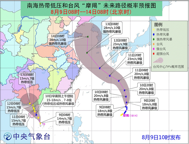 今年第14號臺風“摩羯”昨天在臺灣以東洋面生成。預計“摩羯”將于11日夜間進入東海東部海面,之后在我國東部海區(qū)北上,強度逐漸加強到強熱帶風暴級(10~11級,25~30米/秒)。12日至14日,東海北部、黃海將先后出現(xiàn)7~9級大風,臺風中心經(jīng)過的海域風力有10~11級、陣風12~13級。