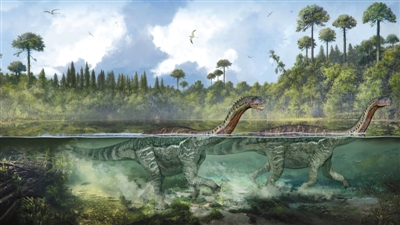 此次發(fā)現(xiàn)的蜥腳類恐龍足跡群中有疑似游泳的行跡,科研團(tuán)隊(duì)據(jù)此繪出了恐龍游泳的復(fù)原圖。本版圖片/受訪者提供