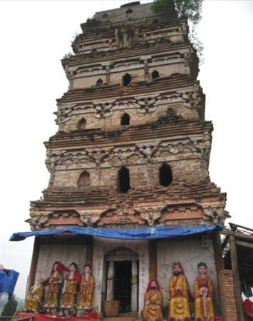 資陽市丹山鎮(zhèn)唐代密檐式磚塔,頂部未按原狀重修,底部佛像被重繪。受訪者提供