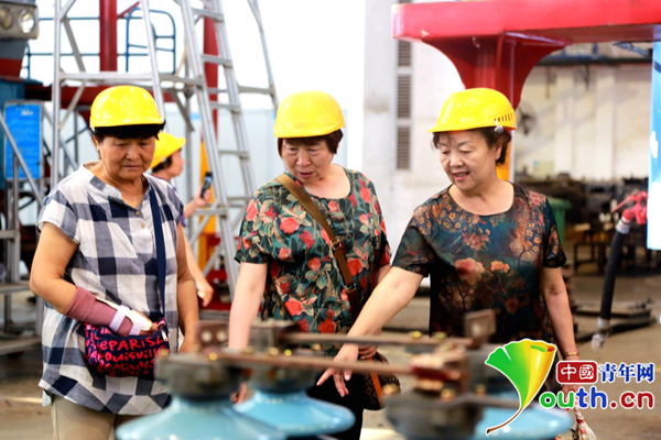 2018年,侯愛華、胡學(xué)政、白燕娥(從左至右)參觀現(xiàn)代化鐵路車間。中國青年網(wǎng)見習(xí)記者 李慧慧 攝