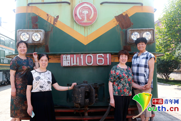 2018年,中國第一代電力機車女司機白燕娥、楊憲美、胡學(xué)政、侯愛華(從左至右)在曾經(jīng)駕駛過的機車前留影。中國青年網(wǎng)見習(xí)記者 李慧慧 攝