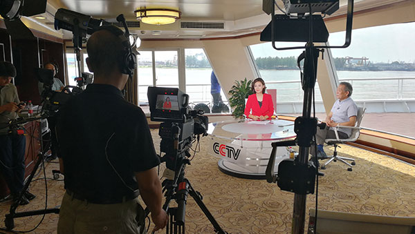 中央電視臺(tái)在客輪上搭建的移動(dòng)演播室正在直播。