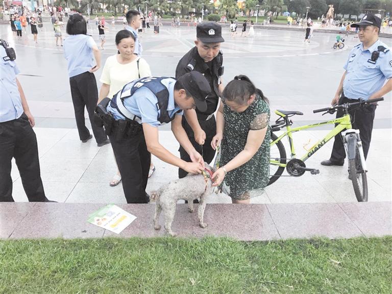 傍晚時,蒲江縣世紀(jì)廣場很是熱鬧,是市民們飯后休閑娛樂散步的集中地,其中也不乏帶著愛犬出來散步的市民。蒲江縣公安局巡防大隊民警走上街頭,現(xiàn)場對沒有為愛犬套上牽引繩的市民進(jìn)行勸導(dǎo)并免費(fèi)發(fā)放牽引繩。面對民警的勸導(dǎo)和發(fā)放牽引繩的執(zhí)法方式,市民們紛紛點贊,“人性化的執(zhí)法方式在宣傳文明養(yǎng)犬重要性的同時,也讓市民們更易接受,從實際出發(fā)緩和了矛盾,值得推廣!”