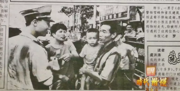 有兩個(gè)陌生男子,聲稱是他的爸爸,試圖領(lǐng)走他。幸虧遇到了剛參加工作不久的21歲民警楊雪峰。楊雪峰抱著他找遍了整個(gè)百貨公司,終于找到了滿頭大汗焦急萬分的爸爸。