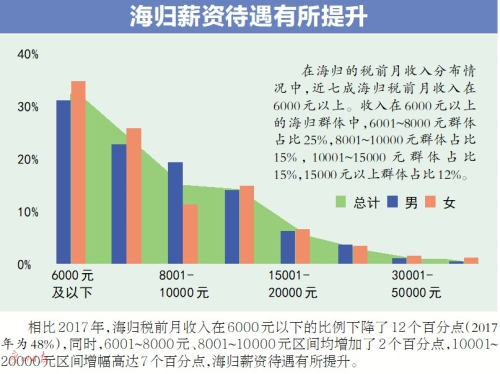 22日,某招聘網(wǎng)站與某智庫機(jī)構(gòu)聯(lián)合發(fā)布了《2018中國(guó)海歸就業(yè)創(chuàng)業(yè)調(diào)查報(bào)告》,重點(diǎn)反映了以“90后”為主的新生代海歸群體在留學(xué)前后的發(fā)展變化。與去年相比,今年調(diào)查的海歸就業(yè)競(jìng)爭(zhēng)力及薪酬均有提升,近七成海歸稅前月收入在6000元以上,月收入在10001~20000元區(qū)間的增幅達(dá)7個(gè)百分點(diǎn)。