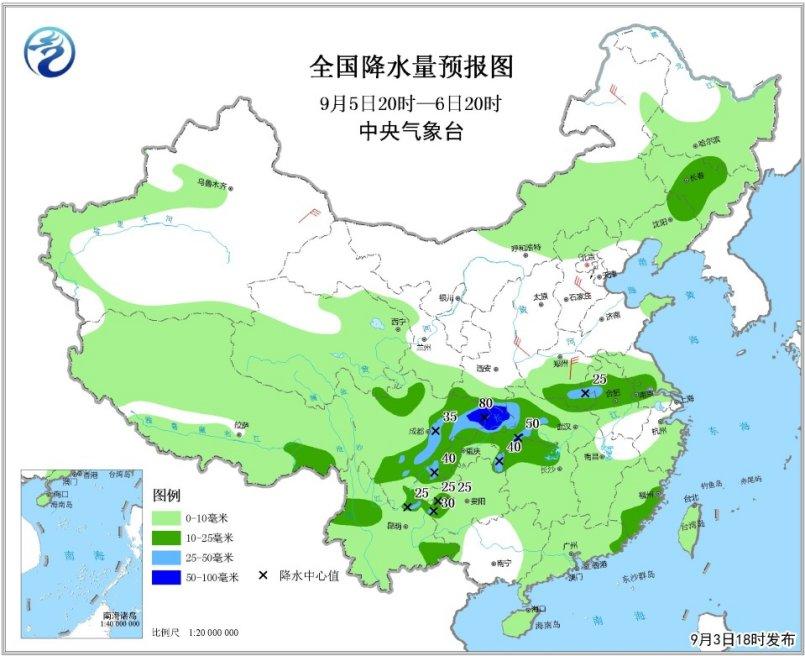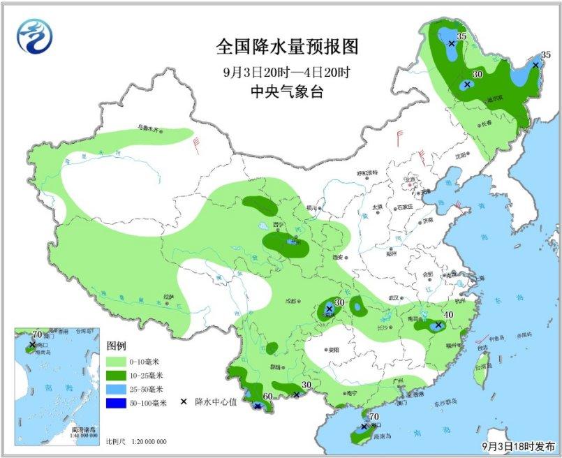圖2 全國降水量預報圖(9月3日20時-4日20時)
