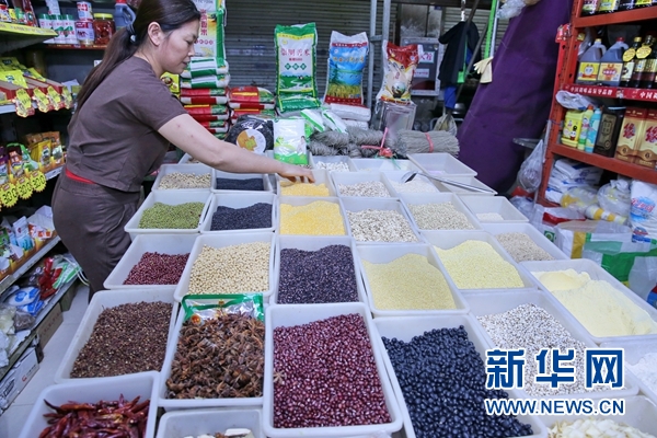 9月10日,商販在江蘇南通一家菜市場(chǎng)五谷雜糧銷售攤位前忙碌。?新華社發(fā)(許叢軍 攝)