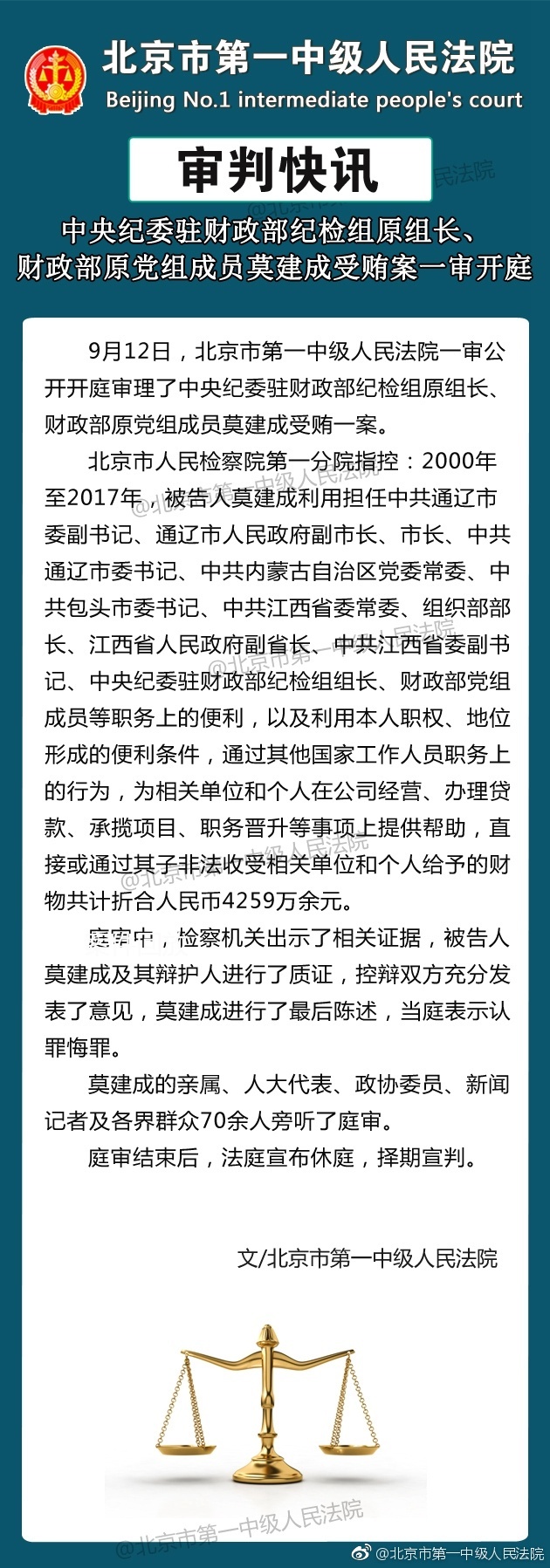 據(jù)北京市第一中級人民法院官方微博消息,9月12日,北京市第一中級人民法院一審公開開庭審理了中央紀(jì)委駐財(cái)政部紀(jì)檢組原組長、財(cái)政部原黨組成員莫建成受賄一案。
