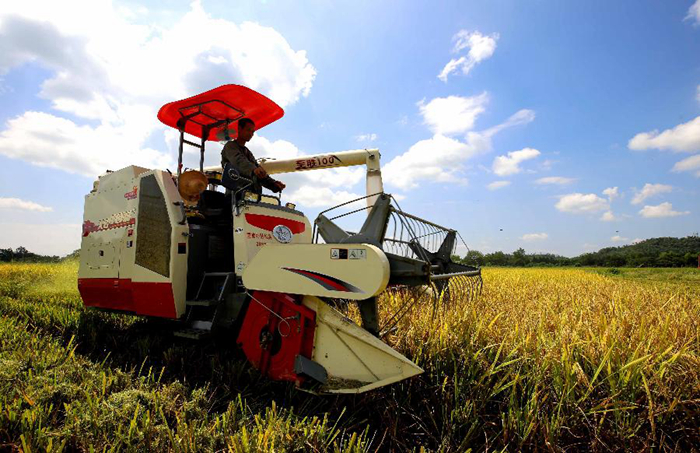 8月22日,江西省靖安縣仁首鎮(zhèn)石下村農(nóng)民駕駛農(nóng)機(jī)收割中稻。新華社發(fā)(徐仲庭 攝)