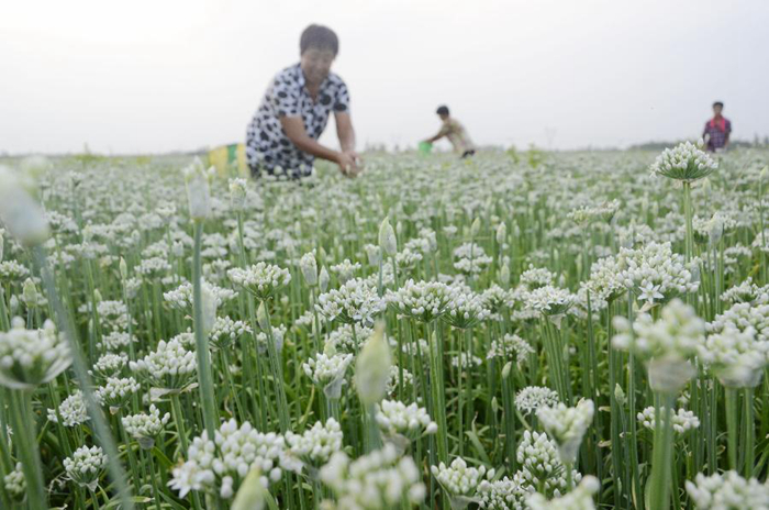 8月28日,在濱城區(qū)三河湖鎮(zhèn)大營劉村樂旋自然蔬菜專業(yè)合作社韭菜基地,村民尹美英在采摘韭花。 新華社發(fā)(李榮新 攝)
