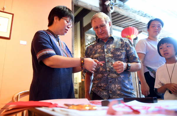 10月3日,在福建福州三坊七巷舉行的非遺剪紙展上,福州楊橋中學(xué)英語老師潘力鷹(左)在向美國客人講解中國的民間剪紙藝術(shù)。當(dāng)日是國慶假期的第三天。新華社記者 林善傳攝