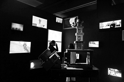 黑色的背景營造出“時光隧道”的感覺、記錄年代關鍵詞的40個燈箱在“隧道”一側亮起,伴隨著參觀者的腳步,從1977年緩步走到2018年?!八淼馈钡牧硪粋葎t是與這些關鍵詞相關的藝術發(fā)展進程中的重要作品。而在展廳的中間,還陳列了一些珍貴的老物件。這是正在798國際藝術交流中心展廳舉辦的“行進中的歷史”,用年代記錄了藝術領域在改革開放以來的發(fā)展進程。
