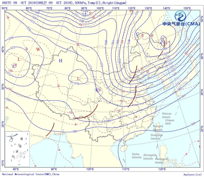 圖為2018年10月9日08時(shí)500hPa高度場(chǎng)實(shí)況