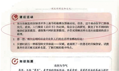 “我上學(xué)的時候,關(guān)于張衡地動儀那一節(jié)圖文并茂,看著后人設(shè)計的地動儀模型,非常容易理解課本內(nèi)容?!苯K無錫僑誼實驗中學(xué)教師涂蘇豫告訴新京報記者,他們學(xué)校的歷史課本一直以來均使用的是人民教育出版社版本。