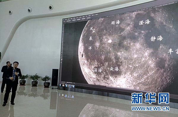 ↑↑相關(guān)負(fù)責(zé)人展示“吉林一號(hào)”拍回的月球表面圖像。