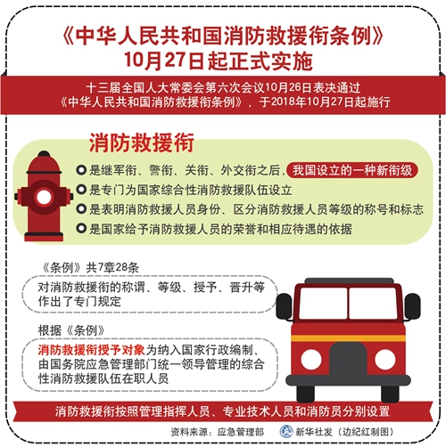 新華社北京10月26日電(記者葉昊鳴)記者26日從應急管理部了解到,十三屆全國人大常委會第六次會議當日表決通過《中華人民共和國消防救援銜條例》,于2018年10月27日起施行。