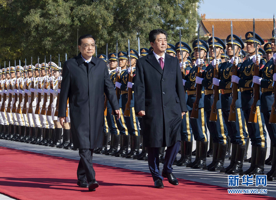 10月26日,國務(wù)院總理李克強(qiáng)在北京人民大會堂同日本首相安倍晉三舉行會談。這是會談前,李克強(qiáng)在人民大會堂東門外廣場為安倍晉三舉行歡迎儀式。 新華社記者李濤攝